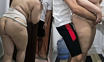 Step-mom is surprised by her sonny and sticks her big cock in the kitchen